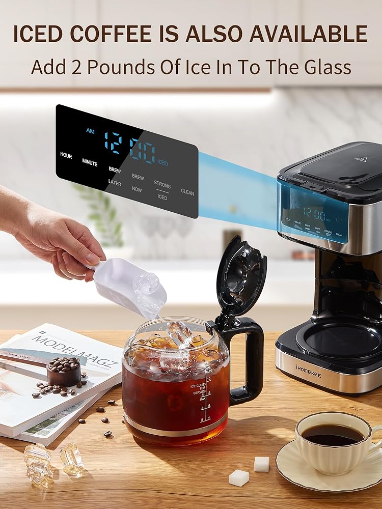 【ICED COFFEE FUNCTION】: If you want a cup of iced coffee once in a while, the Ihomekee coffee maker is the one for you. With the added iced coffee function, just add 2 pounds or so of ice to the cup and you can get delicious iced coffee in minutes.