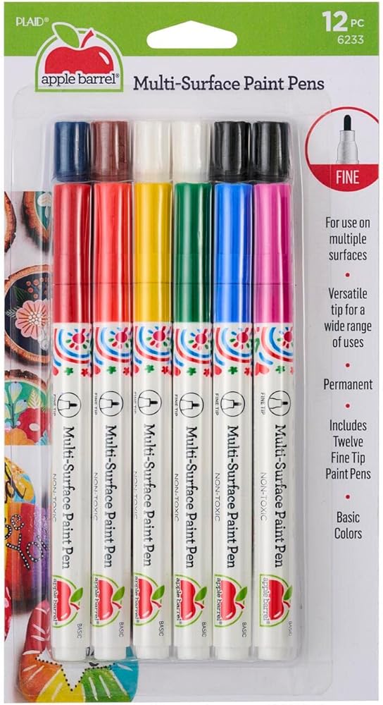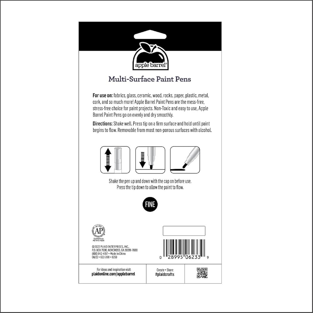 Create fun and funky projects on a variety of surfaces with Apple Barrel Multi-Surface Paint Pens. These are a must-have product for any crafter who loves to doodle. These permanent paint markers can be used on a variety of surfaces including fabric, wood, paper, canvas, metal, glass, rocks, terra cotta, paper mache, and so much more. This non-toxic formula is machine washable, and can be used on indoor and outdoor projects. Great for personalization, celebrations, school projects, and more. Make Apple Barrel Multi-Surface Paint Pens part of your go-to craft supplies for all your art projects!