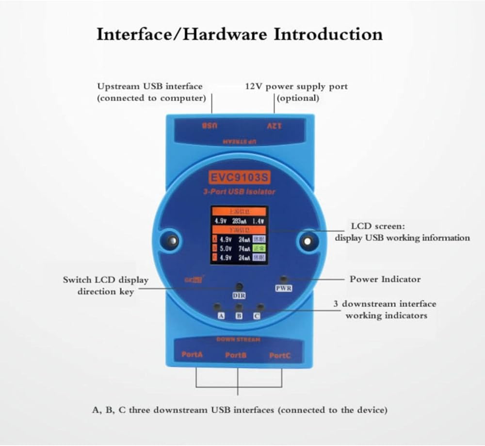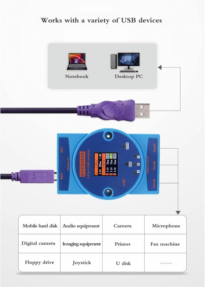 1 Turn 3 Ports isolator works with a variety of usb device such as audio equipment,usb cameras,printer,u disk,etc...