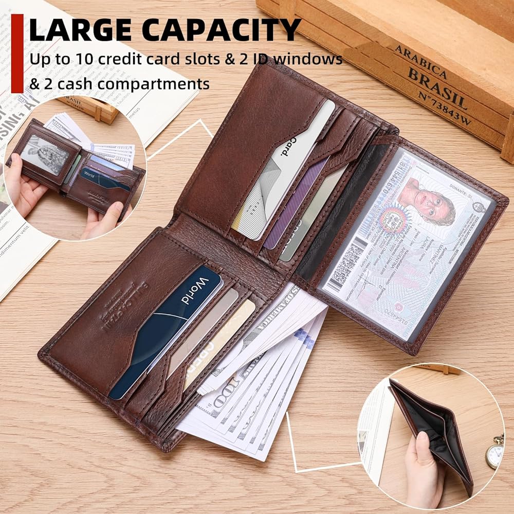 Multiple Compartments: Two ID windows, 10 credit card slots and 2 cash compartments provide ample storage for bills, receipts, cards and more while keeping everything organized.