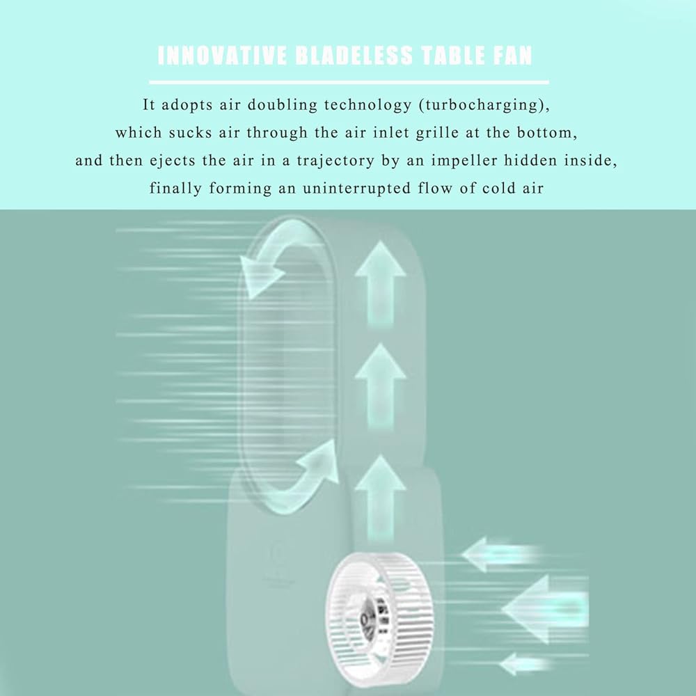 【MODERN BLADELESS DESK FAN】① Safe & portable: You can stick your hand right through the loop and carry it to a different room without turning off the desk fan! ② Bladeless so no injuries! This desk top fan adopts the latest technology of built-in turbine blades, safer for kids, pets and you. ③ Easy to clean: You don't need to unscrew the dust filled grills and blades to wash and dry. ④ Independent touch control of wind speed and light, easy to use, universal in all seasons.