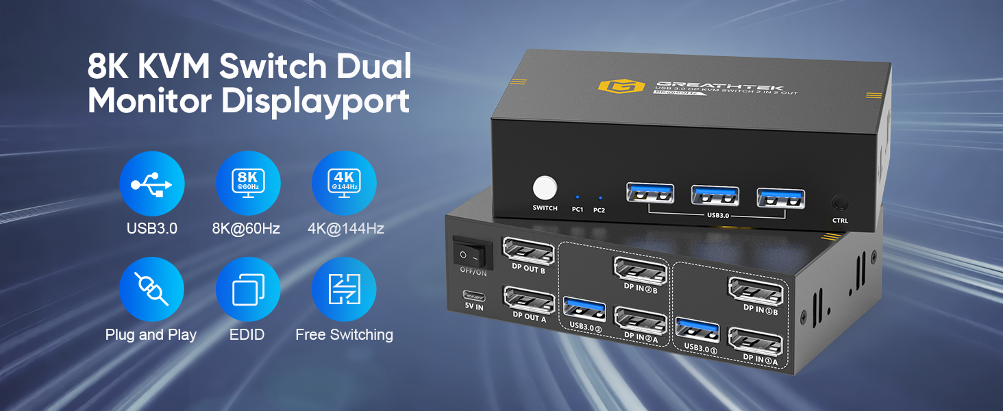 【8K@60Hz KVM Switch Displayport】 USB3.0 KVM Switch displayport can achieve maximum resolution 8K@60Hz. Compatible 4K@144hz /120Hz, 2K, 1080p, etc. It is the ideal choice for your high-resolution and refresh rate devices, bringing you high-definition visual effects!