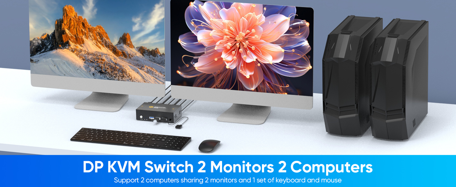 【Displayport KVM Switch 2 Monitors 2 Computers】 2 computers can share 2 monitors and USB 3.0 ports, allowing you to control 2 computers with 1 set of keyboard and mouse. Convenient for you to easily manage devices and improve work efficiency. Compatible with Windows, Mac, Linux, etc.