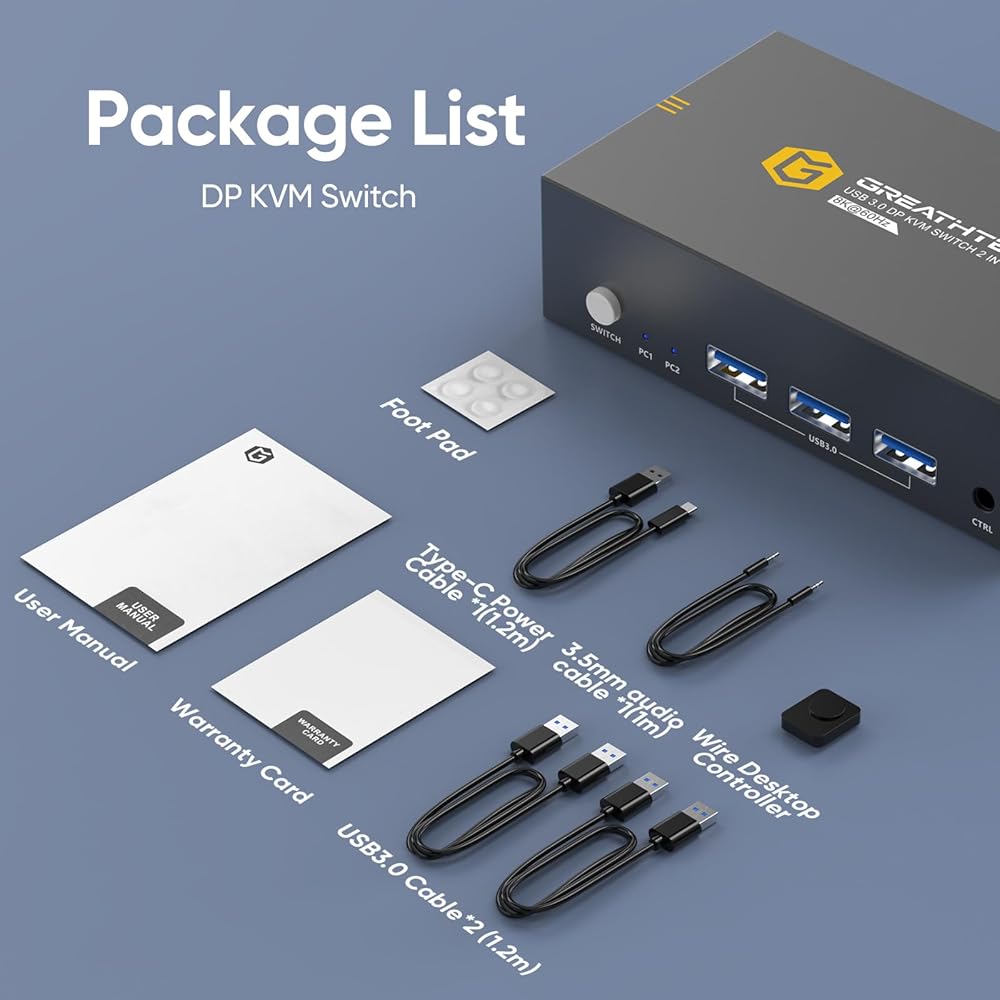 【Good after-sales service】 The package includes 1*KVM Switch, 2*USB3.0 cable, 1*wired desktop remote control, 1* power cable, and 1*user manual. You will receive our lifetime support from GREATHTEK. If you encounter any problems during use, please contact us for assistance.