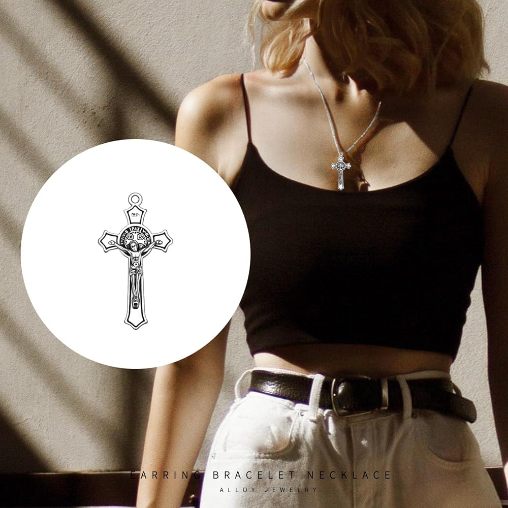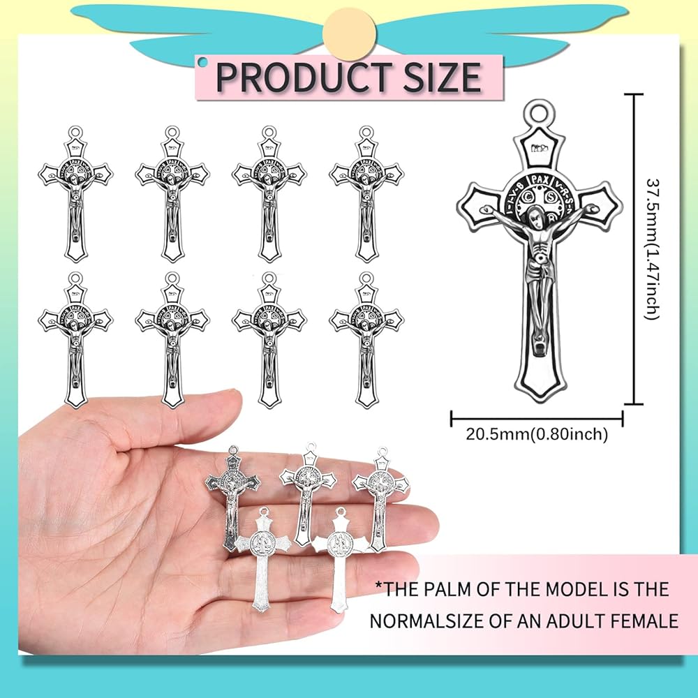 Uniqque design:The charm are made of alloy. Cross is the most classic amulet of religious beliefs.The cross features the Saint Benedict medal at the center and has a the corpus of Jesus on the front.On the other side is St. benedict medal. The just enough detail to be intriguing and beautiful and all the angles are smooth. The classical christ figure is aligned perfectly with the cross design. Accessorize with a necklace bracelet,they can become an important part of rosary necklace.