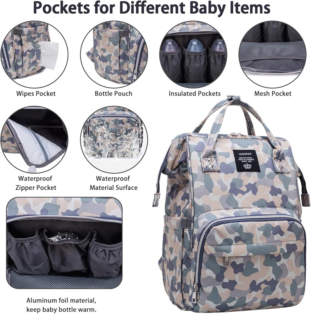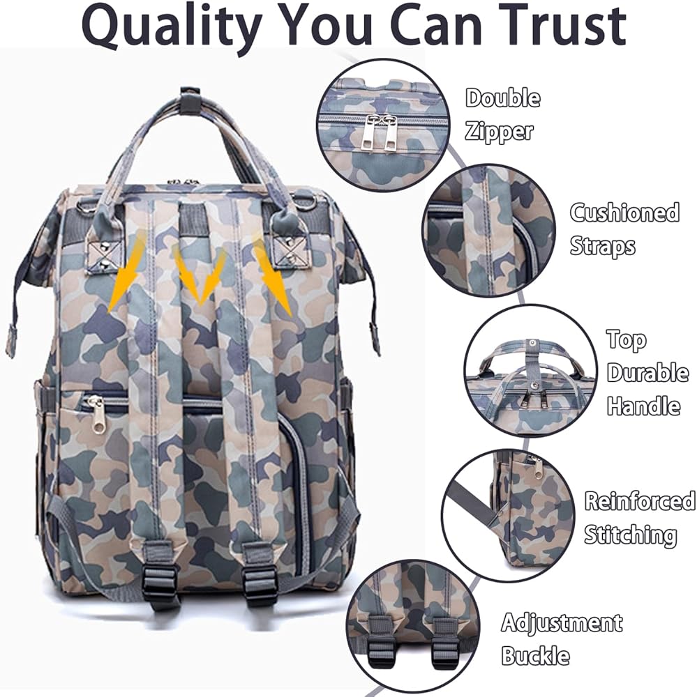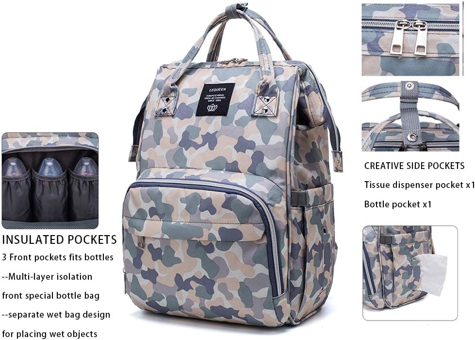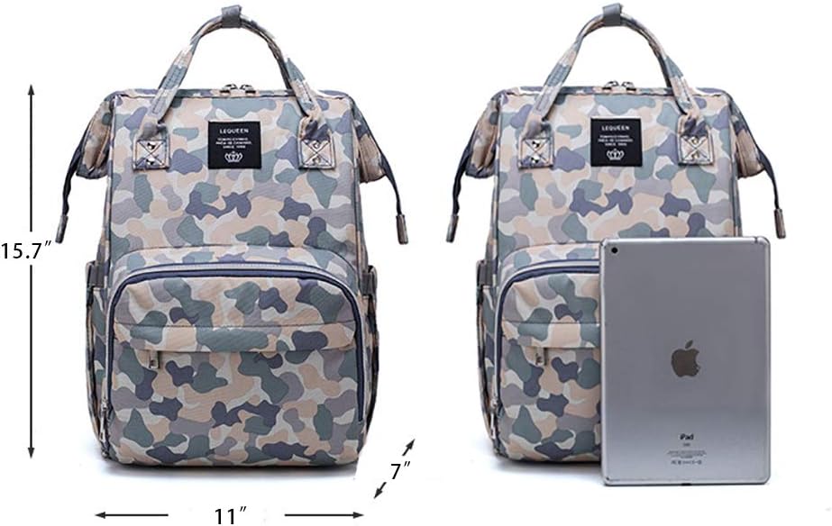 Stylish & Convenient:Neutral Design Diaper Bag with stylish print (camo print pattern). Hands-free by the Stroller Straps, One-Hand Controlling via the Easy-taking Zipper and the Outside Pockets without Opening the Big Zipper. It has both shoulder strap and hand-held strap, so you can use it as backpack or tote bags according to your needs.