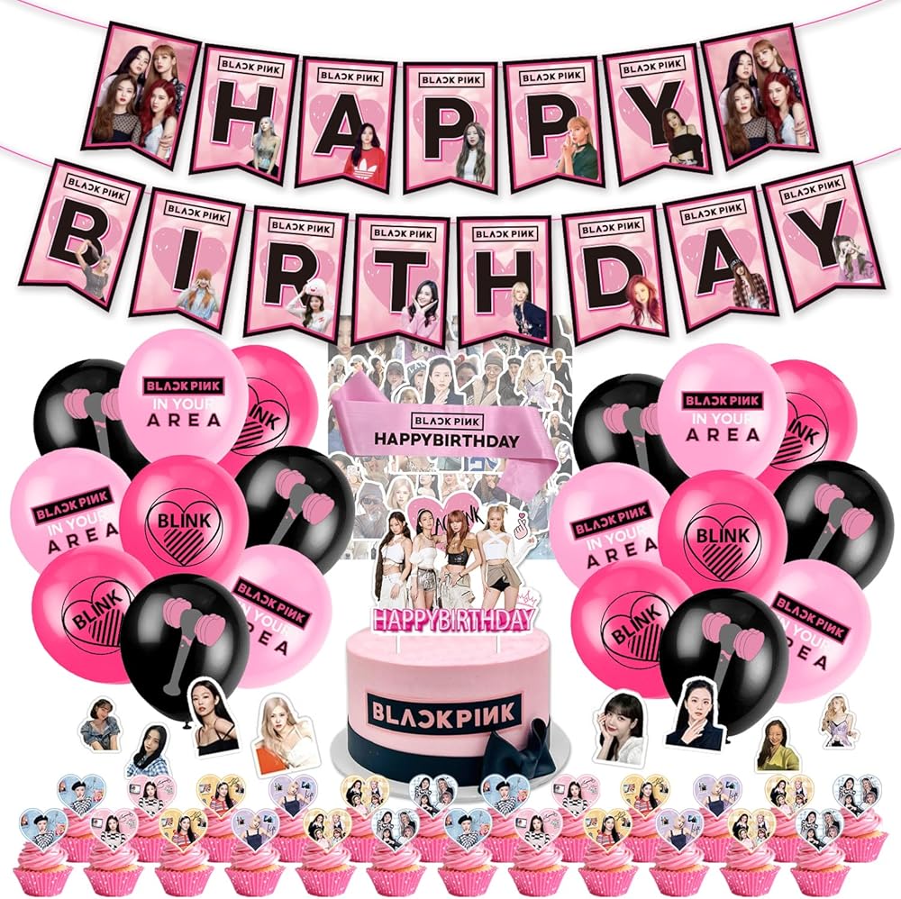 BLACKPINK Party KIT CONTAINS: 50 Cute Stickers, 1 Unique Cake Topper, 18 Latex Balloons of Various colors,1 Pre- assemble Happy Birthday Banner, 24 Cupcake Toppers, 1 Birthday Sash. EASY SETUP: Majority of the product are pre-assembled with minimal setup effort needed.Great choice for BLACKPINK BLINKS fans, girls, boy, teenagers, and adults. ORIGINAL DESIGN: Enjoy this original BLACKPINK designs and bright colors. All elements of this BLACKPINK party supplies set is designed by BLACKPINK BLINKS fans like you! You will love how festive this set looks. We hope this BLACKPINK party set will bring you good memories and joy on your special occasion! HIGHEST QUALITY: we used high quality materials for this party kit. This is safe to use and non-toxic. SHOPPING WITH CONFIDENCE: We're absolutely sure that you'll love this party decorations. If there is any part missing, please contact us and we will send you a new replacement or make a refund.
