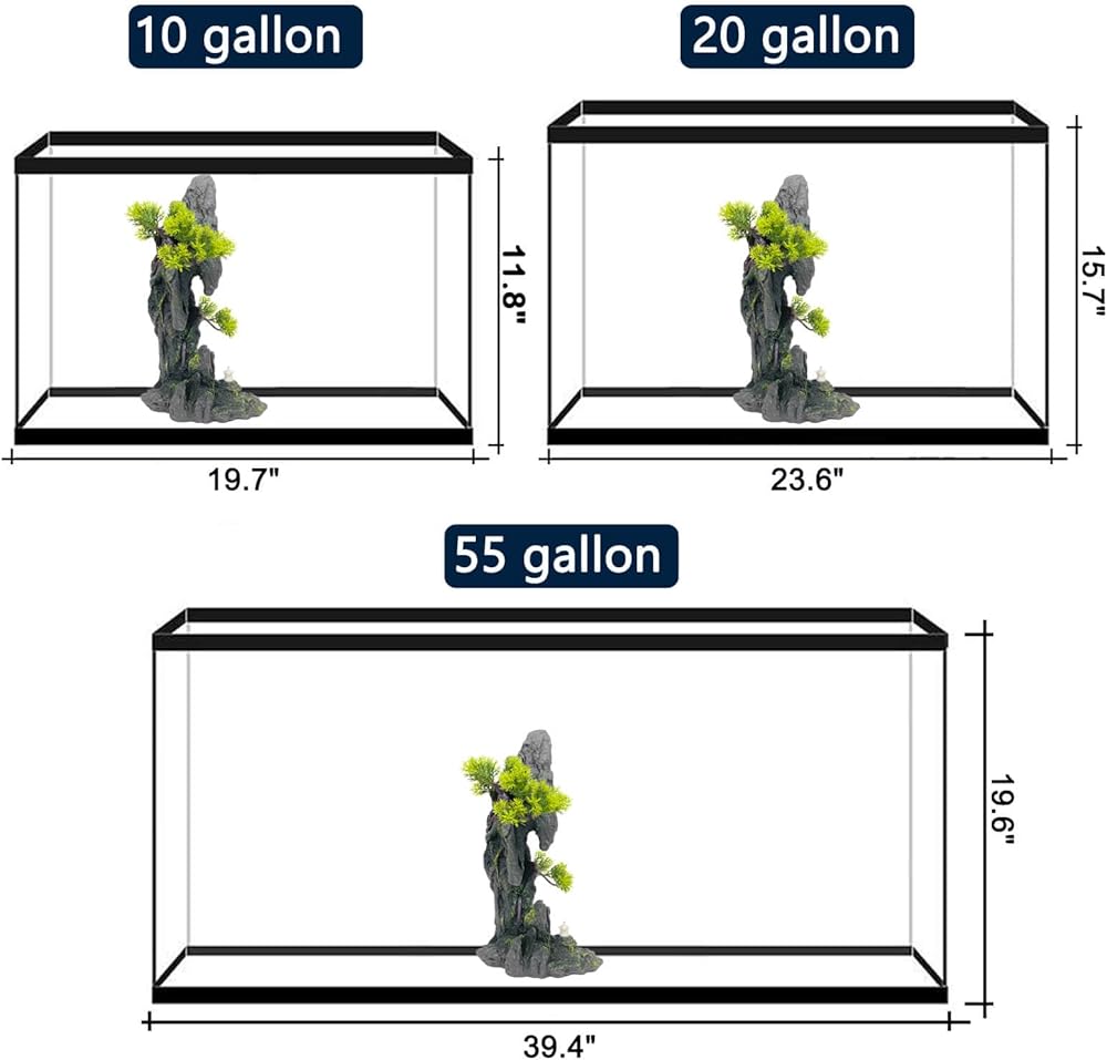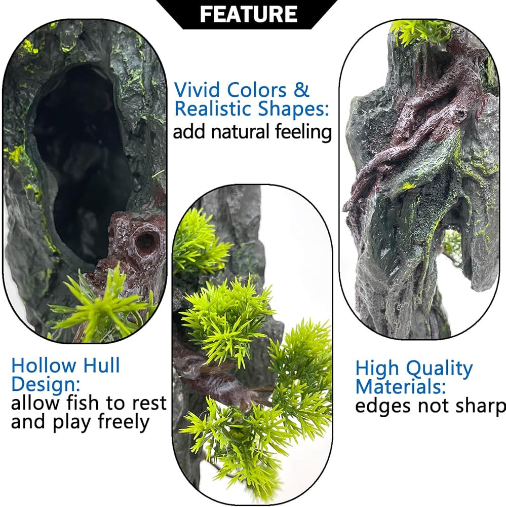 PERFECT SIZE: Size of this aquarium decoration rock mountain is about 11"(L) x 6"(W) x 10"(H). It comes with small artificial plants to aid in landscaping,fish can hiding behind their leaves, making funny together. The design of the aquarium decor provides several rock cave,which allows small fish to play and rest freely in and around it. It is suitable for middle and Large aquarium landscaping.