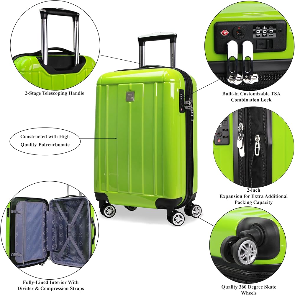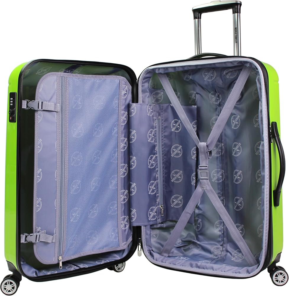 Travel in confidence with this World Traveler Luggage, crafted from high-quality, impact-resistant polycarbonate that's built to withstand the rigors of travel. Each piece features a 3-digit TSA combination lock, ensuring your belongings stay secure while allowing TSA agents to inspect your luggage without damage. With eight(8) spinner wheels, a retractable telescopic handle, and top and side grip handles, this luggage offers effortless maneuverability in any direction. Inside, you'll find a fully lined interior with a flap divider, accessory pockets, and compression straps, keeping your belongings organized and secure. The luggage is also lightweight and expands two inches for more packing capacity, making it ideal for extended trips.