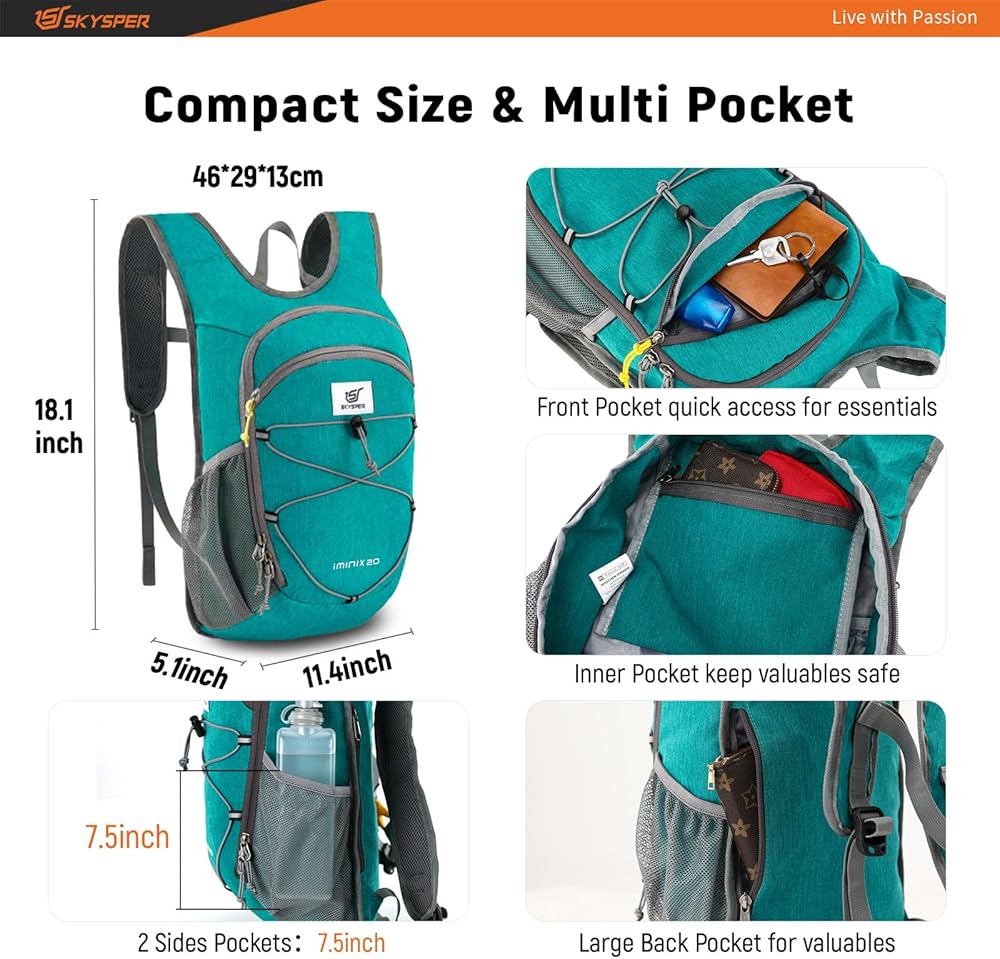 Spacious and Organized: Measuring 16.9*10.8*4.7 inches, this 15l hiking backpack features multiple compartments for easy packing and organization. The large main compartment with a wide opening makes it convenient to pack your travel essentials. Additionally, small hiking backpack includes 3 zippered pockets and a hidden back pocket. Two side mesh pockets (7.5 inches high) offer additional storage options for various items.