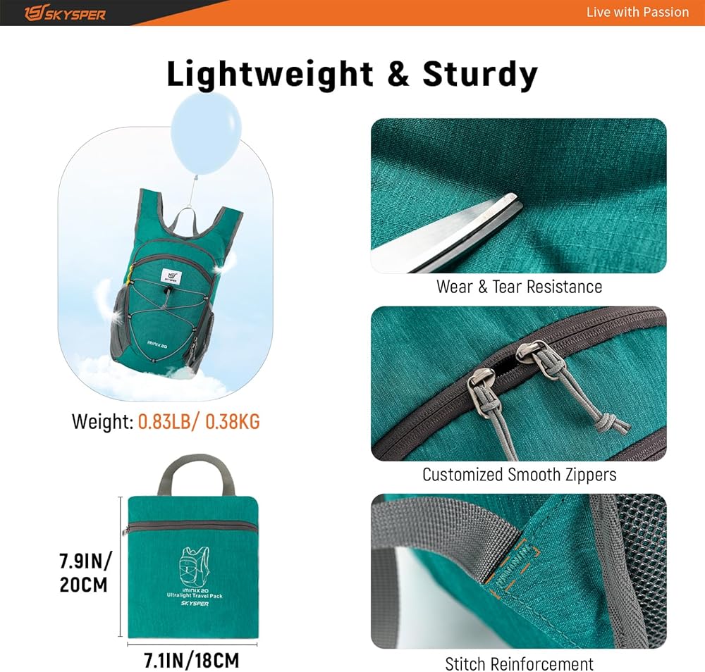 Lightweight and Sturdy: Weighing approximately 0.75lb, this lightweight travel backpack boasts a strong polyester fabric that is resistant to abrasion and tearing. The smooth and reliable SBS zippers ensure easy opening and closing, while reinforced handles and stitching provide added durability. These meticulous details contribute to a superior and comfortable user experience.