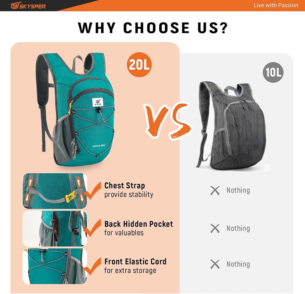 Enhanced Comfort with Upgraded Chest Strap: Designed for leisurely hiking, this hiking daypack prioritizes comfort with an added chest strap equipped with a safety whistle. This feature alleviates strain during travel, ensuring stability and reducing the burden on your shoulders. The chest strap is detachable for convenience, allowing you to stow the lightweight backpack away when not in use.