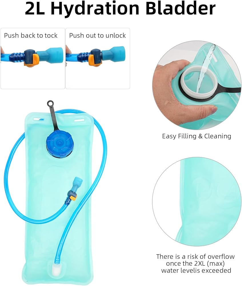 Leakage Proof Water Bag - Removable hydration hose with suck mouthpiece, it's simple to drink, pull the rubber mouthpiece out and the water comes right out. The large opening makes it easy to add ice cubes, clean and dry. There is even a clip on the shoulder strap to help secure the bladder hose