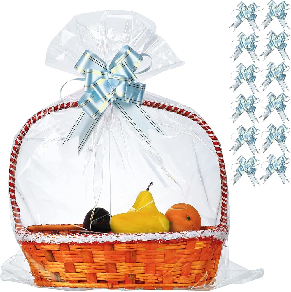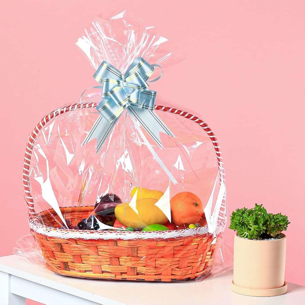 Includes: These large clear cellophane bags includes 50 pcs of clear cellophane gift bags and 50 pcs of pink ribbon bows. They measures 32 x 40 inches, which is a jumbo size for multi-purpose use. The 50 packs of extra-large cellophane wraps are great to organize fruit baskets, a holiday basket, Christmas tree, oversized plush toys, baked goods, and even a get-well-soon flower basket.