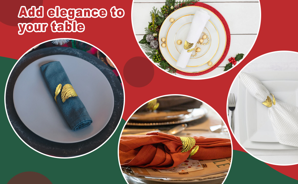 EXQUISITE CRAFTSMANSHIP The leaf napkin rings are made of high quality metal alloy by plating and polishing process, sturdy and long-lasting, not easy to tear or break, can be used for a long time; the rings are polished and cut neatly, the surface is smooth, you don't need to worry about scratching the table or napkin.