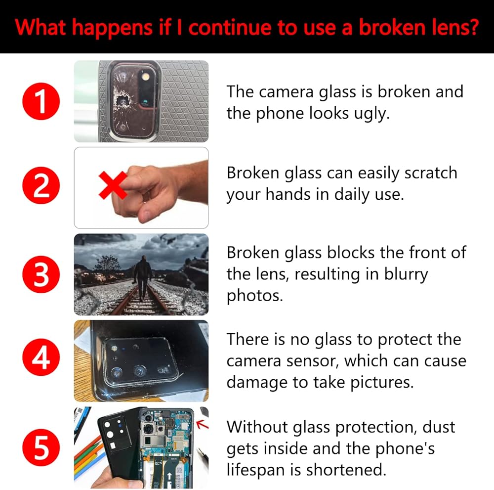 【ماذا يحدث إذا واصلت استخدام عدسة مكسورة؟ 】بعض النتائج المحتملة: مثل المظهر القبيح، وخدش نفسك، والصور الباهتة، وفقدان وظيفة الكاميرات، وعدم القدرة على التقاط الصور. أو حتى قد يؤدي ذلك إلى إتلاف أجهزة استشعار الكاميرات. علاوة على ذلك، سينخفض عمر الهاتف نظرًا لأن الغبار أو السوائل قد تدخل إلى هاتفك من خلال الشقوق الموجودة في الزجاج. والأخطر من ذلك أنه قد يؤدي إلى تلف اللوحة الأم عند فقدان هاتفك. لذا يرجى استبدال العدسة المكسورة في أسرع وقت ممكن!