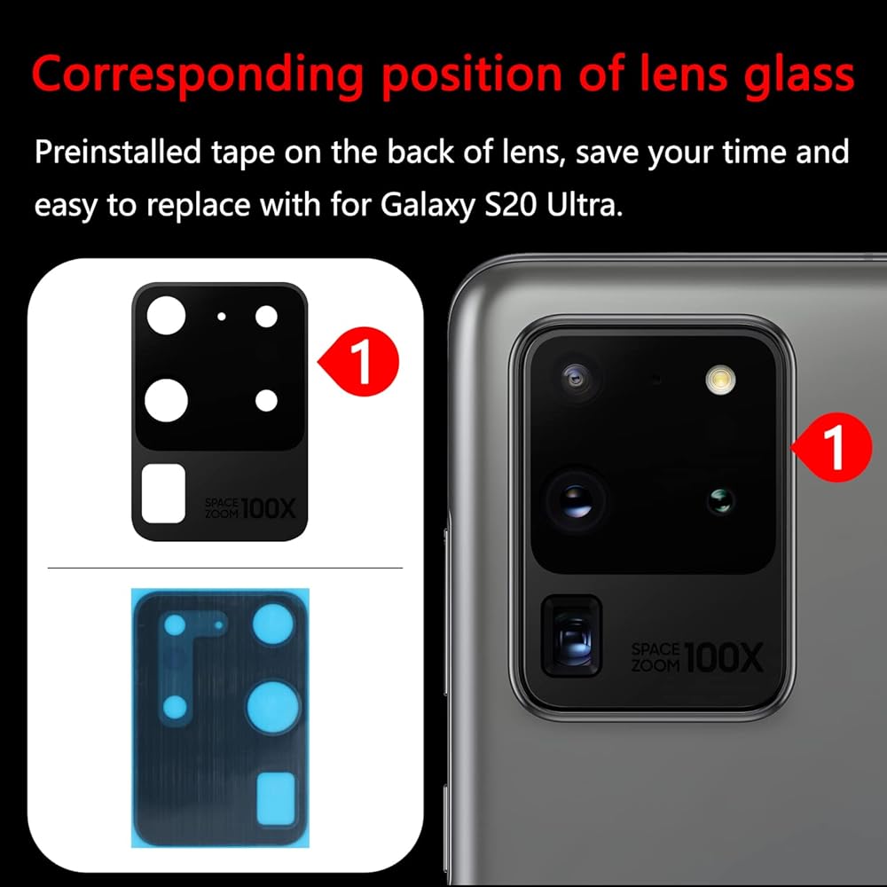 2 قطعة Soaosdr استبدال زجاج عدسة الكاميرا الخلفية الأصلية لهاتف Galaxy S20 Ultra 6.9 بوصة مع طبقة واقية للعدسة + لاصق مثبت مسبقًا + مجموعة أدوات إصلاح + دليل التثبيت