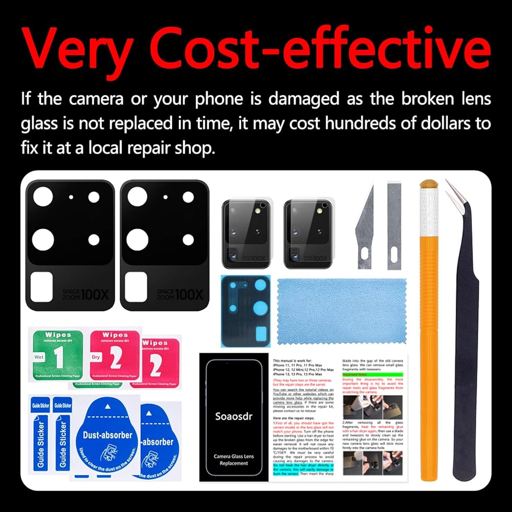 【مجموعتان من زجاج عدسات الكاميرا وفعالة من حيث التكلفة】احصل على مجموعتين بسعر مجموعة واحدة. يتم تضمين مجموعة إصلاح العدسات الإضافية للاستخدام في حالة وقوع حادث. إذا تعرضت الكاميرا أو هاتفك للتلف بسبب عدم استبدال زجاج العدسة المكسور في الوقت المناسب، فقد يكلف إصلاحه مئات الدولارات في ورشة إصلاح محلية. إذا لم يعمل هاتفك بشكل طبيعي بعد الإصلاح، فقد تضطر إلى شراء هاتف جديد. حوالي 10 دولارات يمكنك صنعها بنفسك مقابل بضع مئات من الدولارات في ورشة التصليح، أيهما أكثر اقتصادا؟