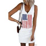Ameircan Flag Ribbed Tank Mini Dress for Women 4th of July Patriotic V Neck Button Basic Henley Beach Sleeveless Dresses