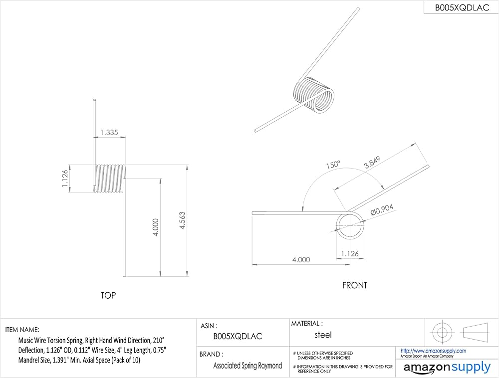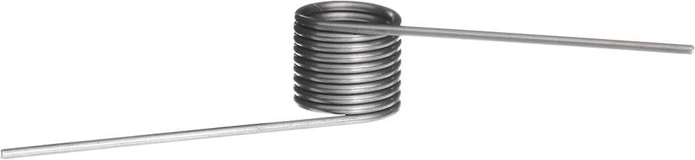 This helical torsion spring is right hand wound and made of steel music wire for greater strength than stainless steel. It has straight torsion ends (legs) for a wide variety of uses, and the free (unloaded) deflection angle between the ends is 210 degrees. The spring has a maximum operating temperature of 250 degrees Fahrenheit (121 degrees Celsius). This music wire torsion spring meets ASTM International standard ASTM A228 and Aerospace Material Specifications standard AMS 5112 for quality assurance, and is used in various applications, including hinges, levers, and switches.
