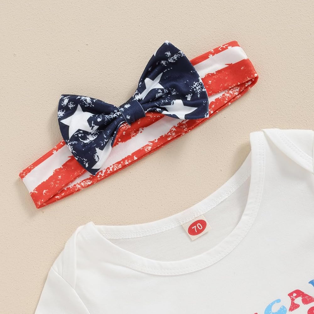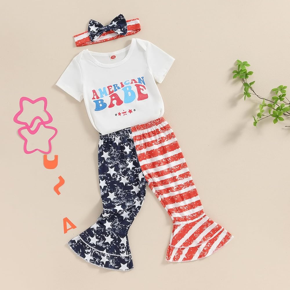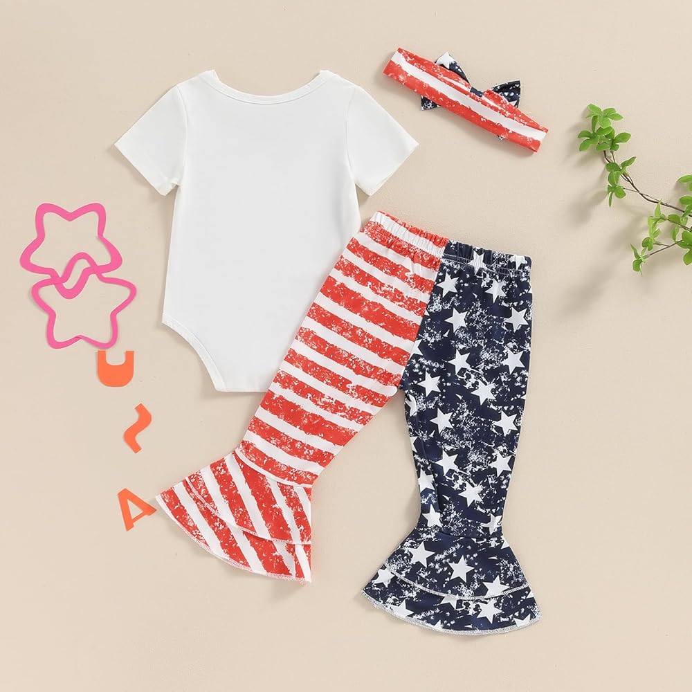 Baby Girls Summer Outfit, Short Sleeve Romper with Leopard Print Flare Pants and Bowknot Headband 4th of July Clothing