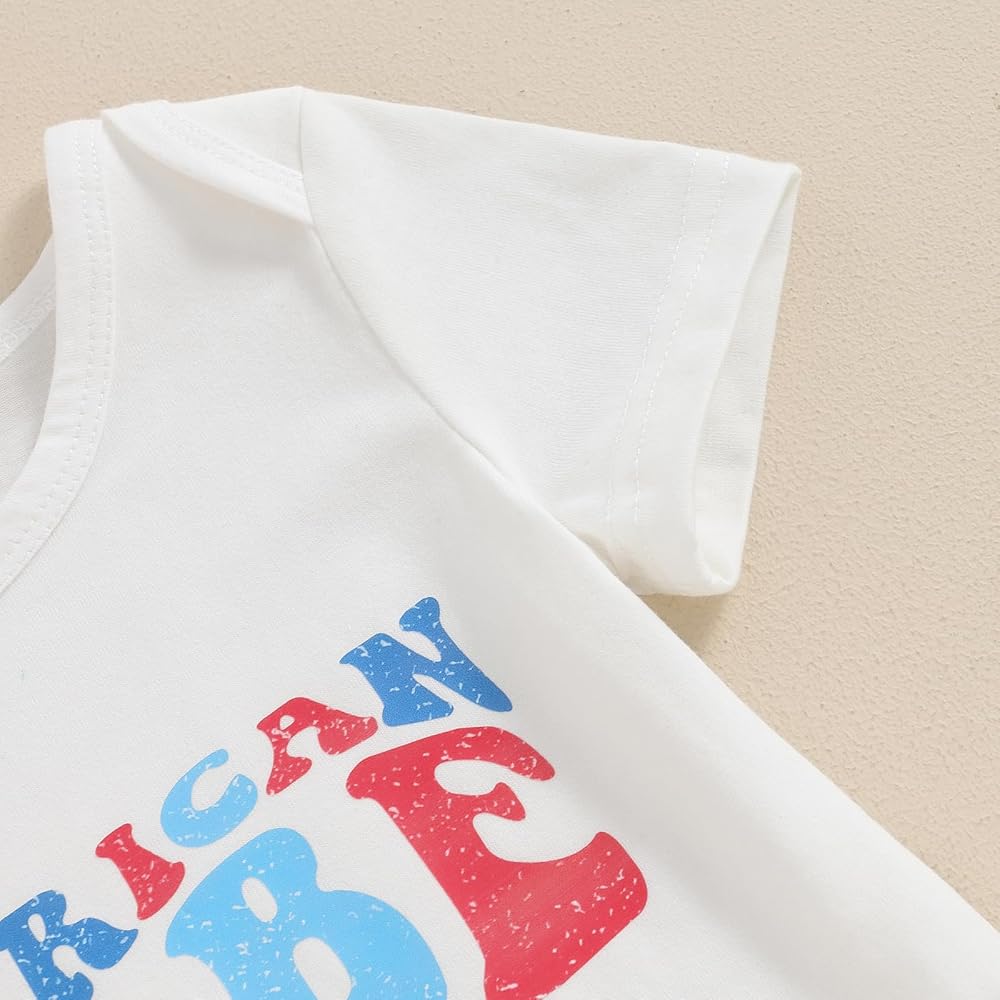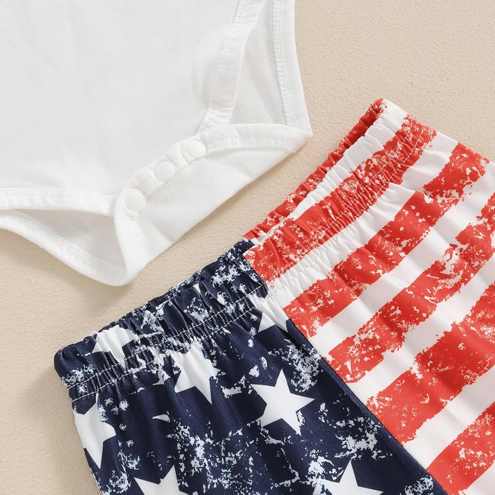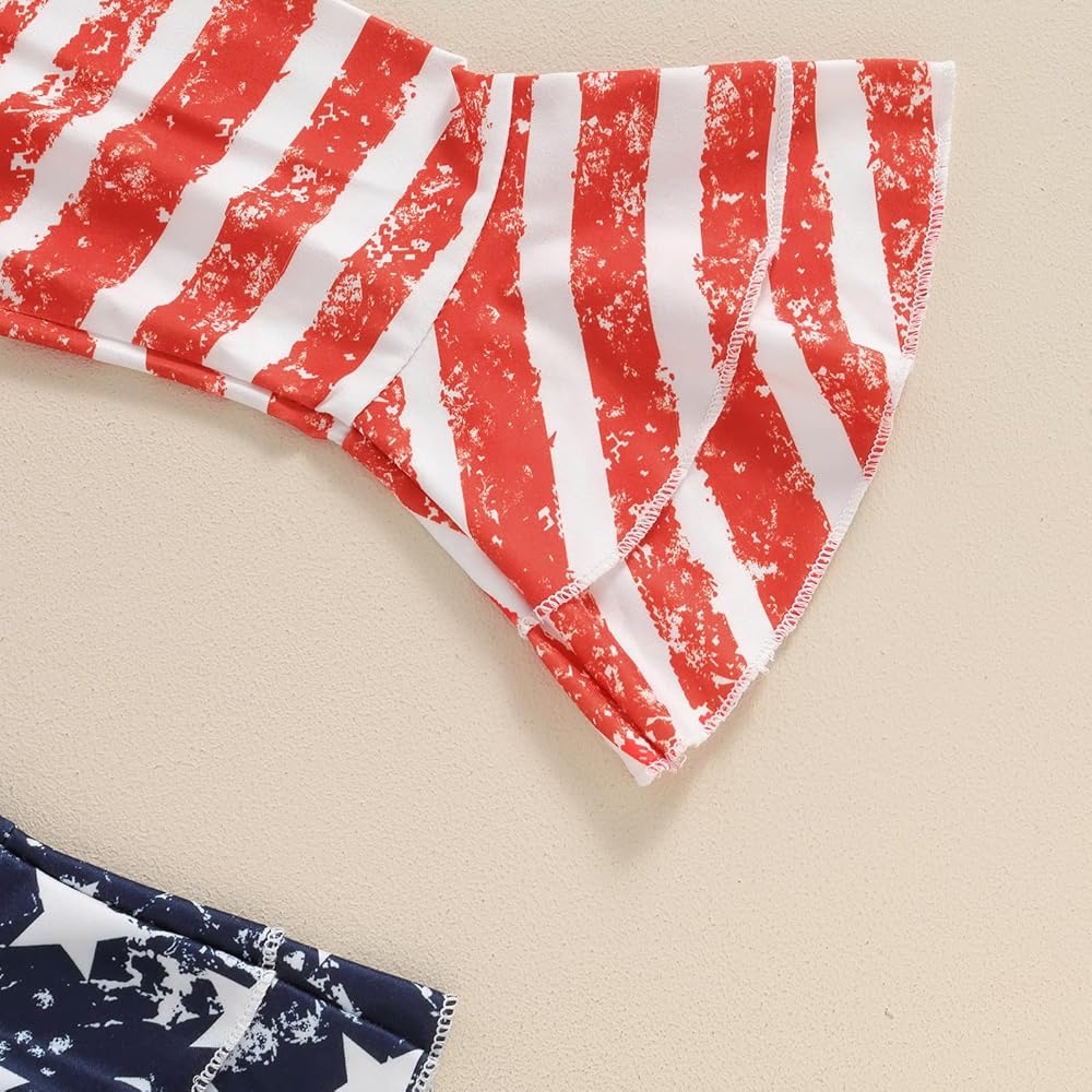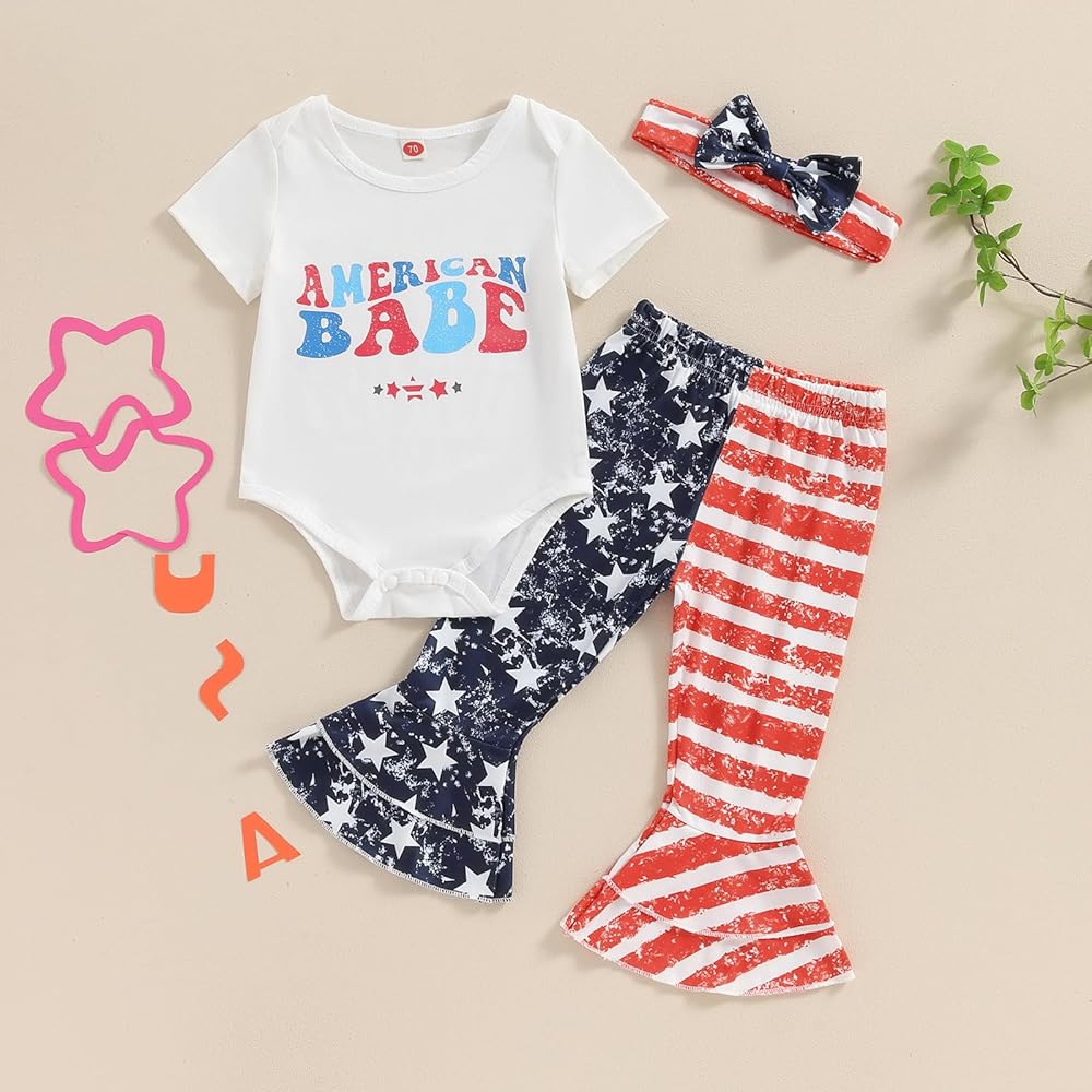 Baby Girls Summer Outfit, Short Sleeve Romper with Leopard Print Flare Pants and Bowknot Headband 4th of July Clothing