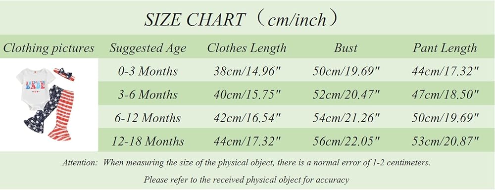 0-3M Bust: 18.5 Pants Length: 13.78 Waist: 13.39 Romper Length: 14.17 Suggest Age: 0-3 Months