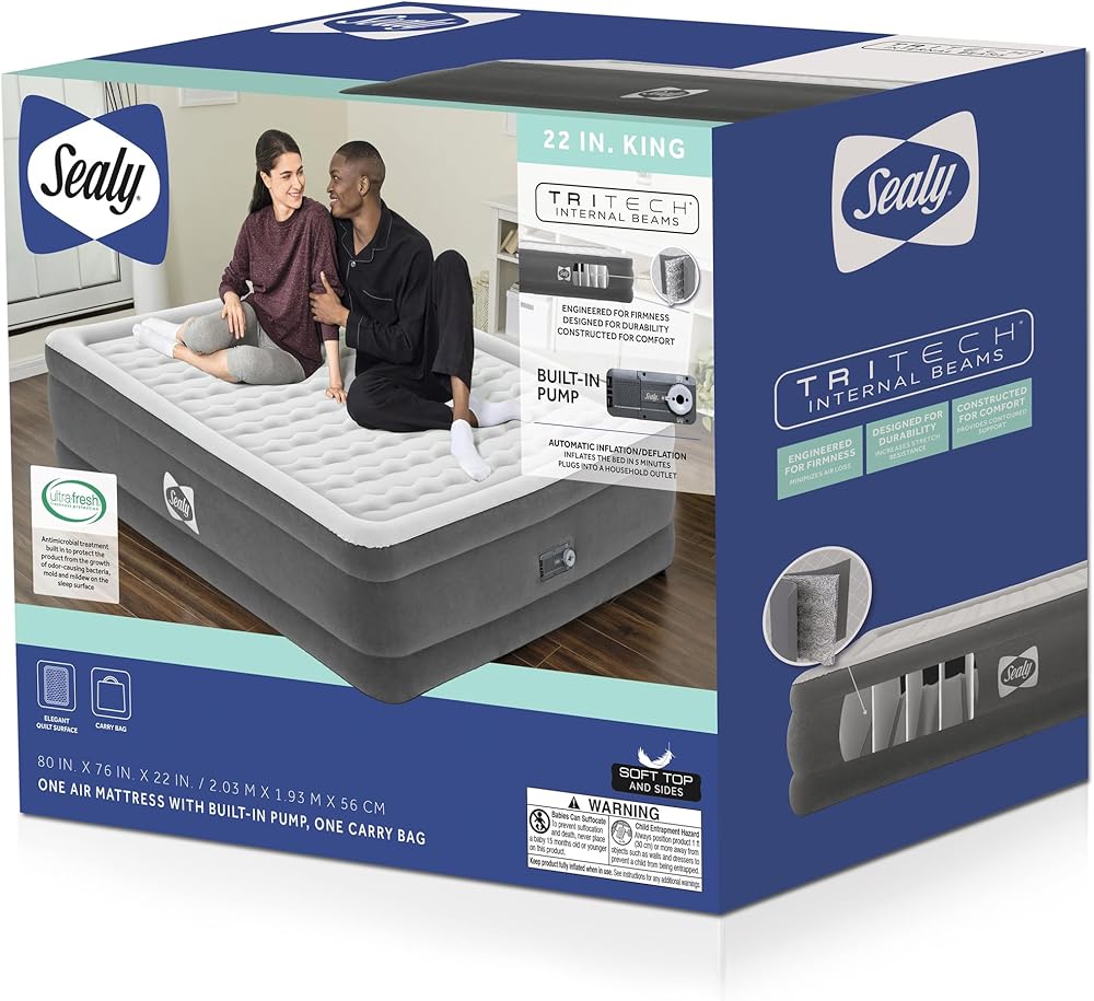 Wake up renewed and refreshed on the Sealy Tritech Air Mattress! This 22” tall, King-sized bed promises strength, durability and comfort all night long. Its compact size and built-in pump make it quick and convenient for use whenever you need it. Plus, with the Ultra-Fresh surface, your bed will be protected from the growth of odor-causing bacteria, mold and mildew on the sleep surface. Durable Construction: This bed features comfortable flocked sides and sleeping surface, along with sturdy construction. The internal structure of this bed is made with Tritech™ material offering durability and strength, while also allowing the mattress to keep the same shape no matter how many times it's inflated and deflated. This premium grade material increases internal stretch-resistance and provides contoured support for all night comfort. Engineered to provide a flat, comfortable sleeping surface and an elegant look, the unique wave beam design ensures you get a great night's sleep and ultimate comfort. Simple Setup: The built-in AC air pump inflates the mattress in less than 5 minutes, so it is ready for bed when you are. In the morning, the quick release screw valve allows for easy deflation. Simply place your flattened bed in the included carry bag for easy transport and storage.
