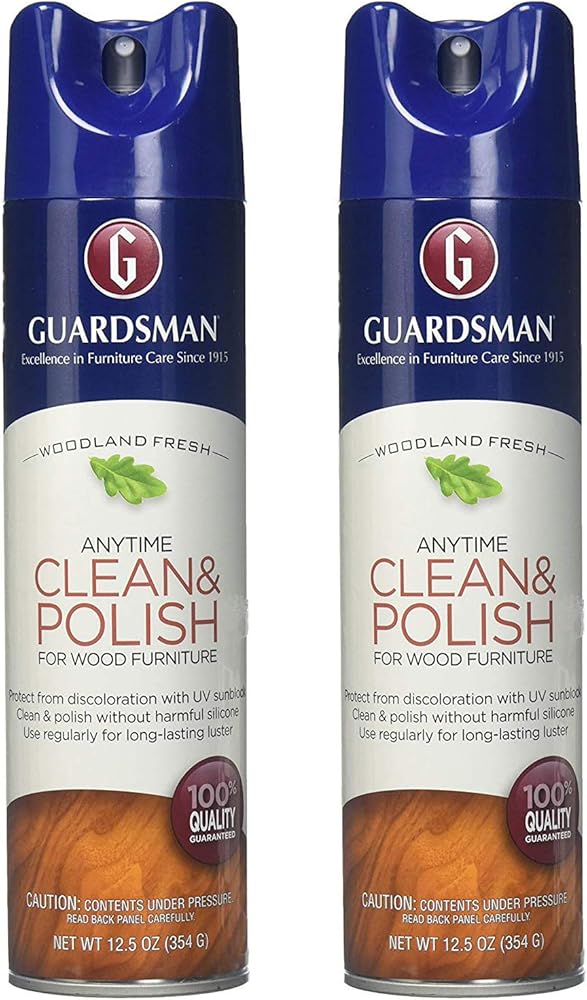 Guardsman Revitalizing Wood Polish UV Protection 12.5oz Aerosol. Guardsman UV Protection Revitalizing Wood Polish delivers a rich, clean, low-luster shine for a natural glow without oily residue. Our premium formula contains UV absorbers, protecting wood against fading and discoloration from sun exposure. Used regularly to polish wood, it protects and beautifies while helping to conceal the appearance of fine surface scratches. And unlike some polishes, Guardsman Revitalizing Wood Polish contains no waxes, abrasives, or silicones, and leaves no greasy film or build up. Excellence in furniture care since 1915.