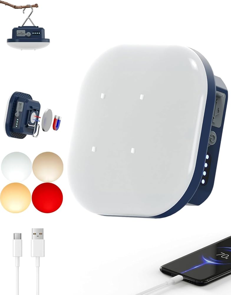 Magnet Base & Multifunction Hook: this rechargeable lantern built-in N54 magnet patch which has strong enough magnetic adsorption on any metal surface. this camping light can aslo be a desktop lamp with our special design standable hook.