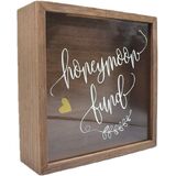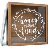 Prepare for your special trip with Honeymoon Fund Wood Box! This square MDF brown wood bank features a clear acrylic panel on the front so you can see the progress of your funds accumulating. The front of this panel features white text and a small branch design. It features an oval slot on the top, so bills and coins can easily be inserted. Place it on your gift table and anticipate adventures away from home!