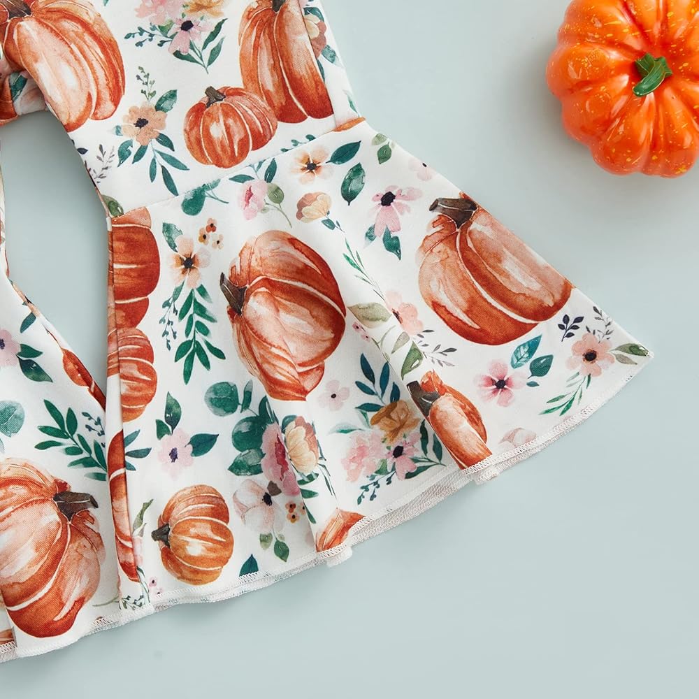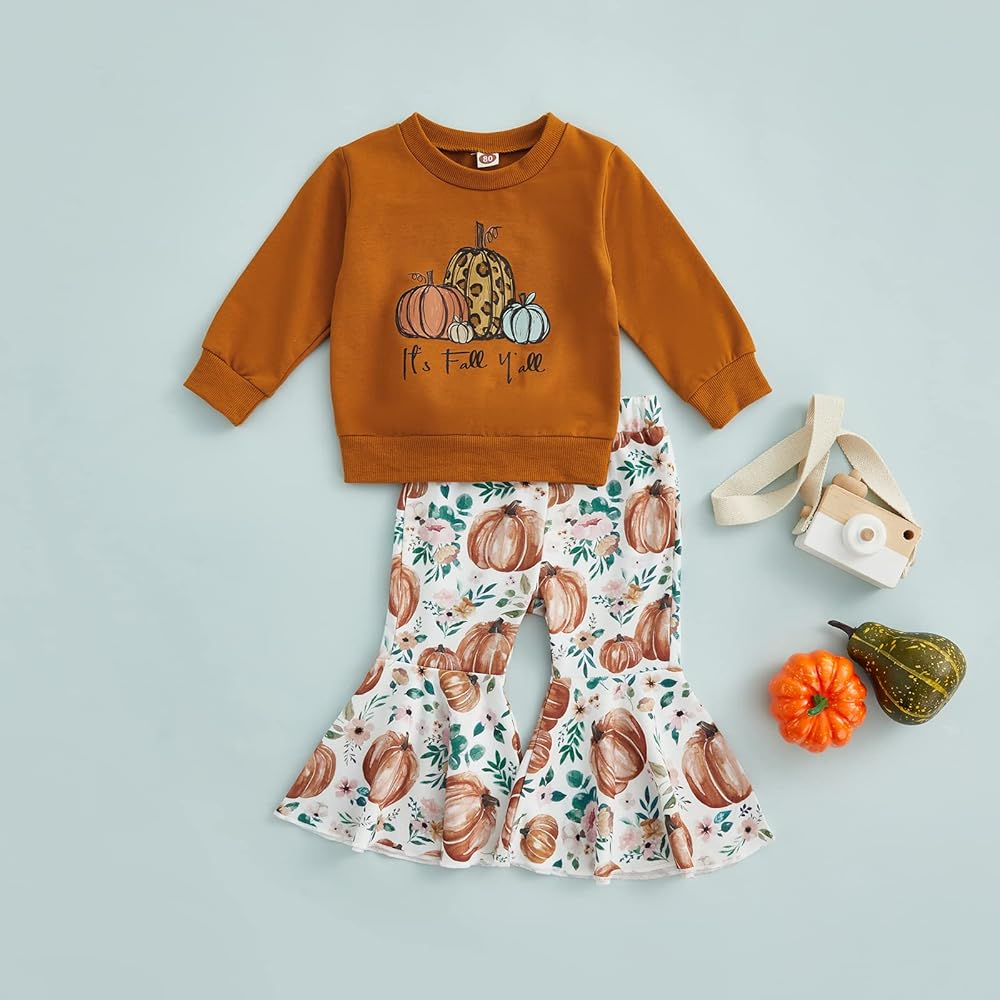 Features: Baby sweatshirt top flare pant set. Halloween style with letter pumpkin witch hat pattern printed, long sleeve crew neck pullover sweatshirt tops, high waist flared trouser set. christmas style with letter print long sleeve round neck sweatshirt, solid color flare pants outfits. Both cute and simple two piece set.