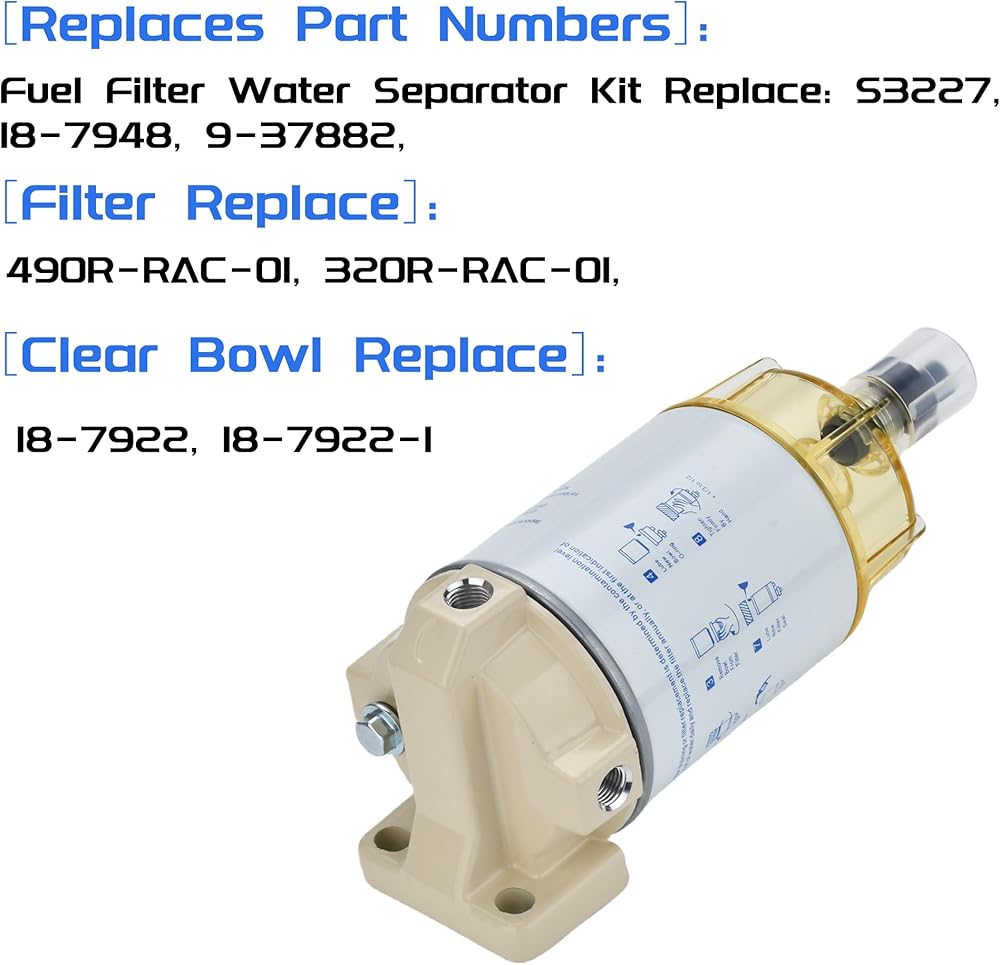 🌱[Replaces Part Numbers]:Fuel Filter Water Separator Kit Replace: S3227, 18-7948, 9-37882,Filter Replace: 490R-RAC-01, 320R-RAC-01,Clear Bowl Replace: 18-7922, 18-7922-1