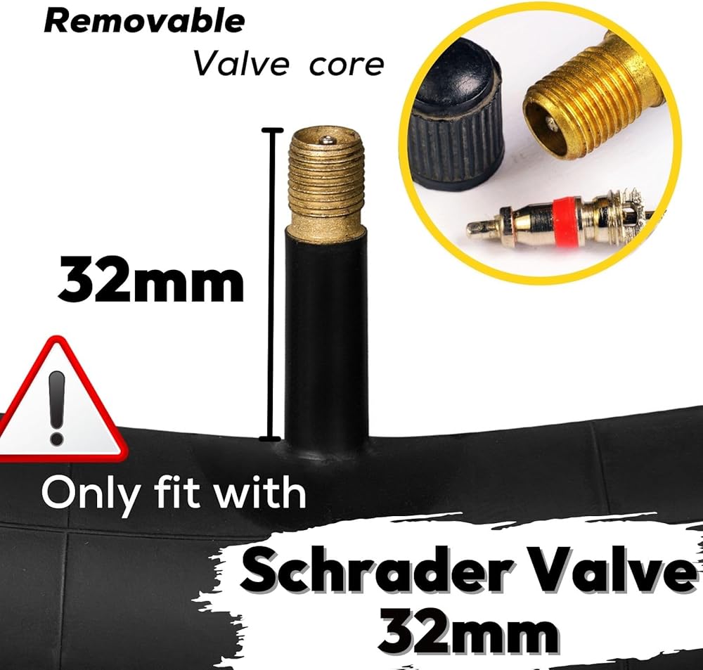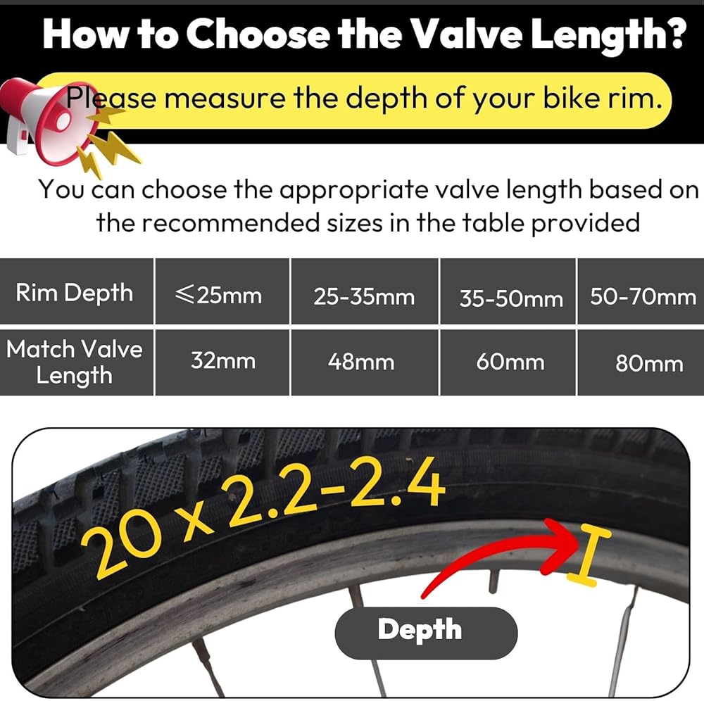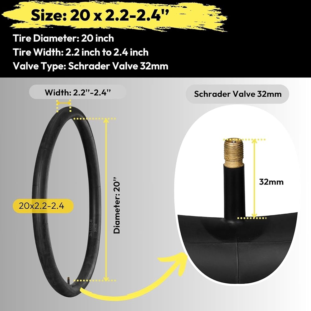𝐒𝐢𝐳𝐞: 32mm Schrader valve stem (Standard Metal valve). Designed for 20-inch bike tires with a width of 20x2.2, 20x2.25, 20x2.3, 20x2.35, 20x2.4 inches. This 20'' bicycle inner tube can adapt to different tire dimensions. This bike tire inner tube has a broad range of applications. It can be used on various bicycles, including folding bikes, compact urban commuters, and BMX bikes. Its adaptability makes it a versatile choice for diverse riders and bike styles.