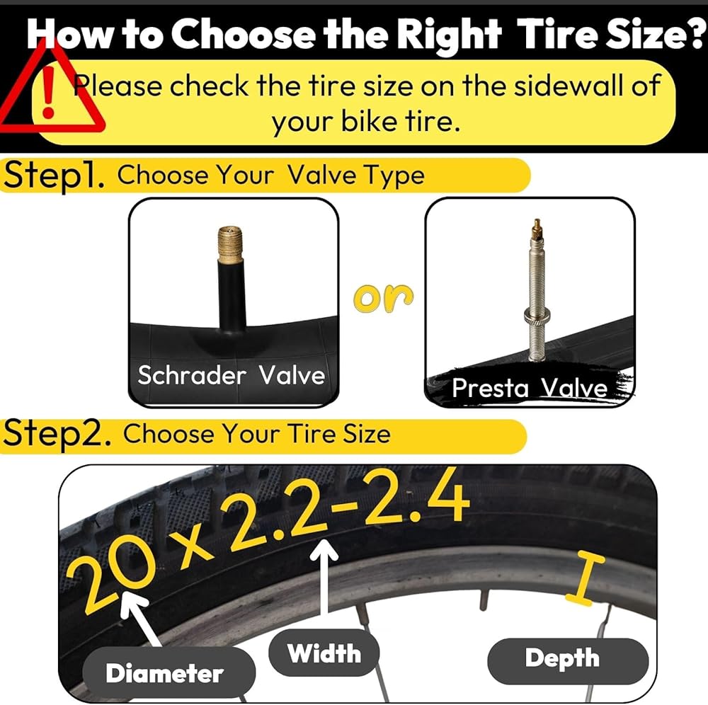 𝐄𝐚𝐬𝐲 𝐭𝐨 𝐈𝐧𝐬𝐭𝐚𝐥𝐥: The 20x2.2'', 20x2.25'', 20x2.3'', 20x2.35'', 20x2.4'' bike tire tube is user-friendly and designed for easy installation, making it accessible for riders who prefer to handle bike maintenance themselves. It also has 5 bike tire levers to help you finish installation quickly. With minimal effort, you can replace your old inner tube, saving time and money.