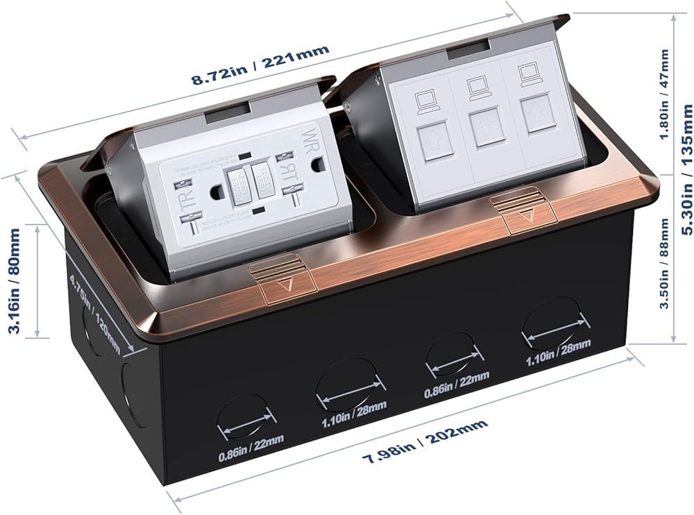 KYHSHJ floor box can be installed in hardwood flooring, carpeting, tile flooring, granite and marble counter tops.