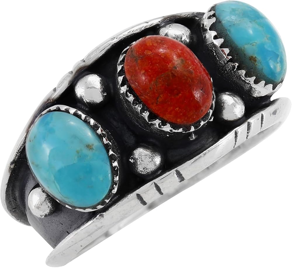Distinctive ring for men. Made of solid sterling silver & genuine gemstones. Fine craftsmanship. Trendy but with a touch of Southwest flair that is always exciting! Approx. 1/2" wide (see ruler image).
