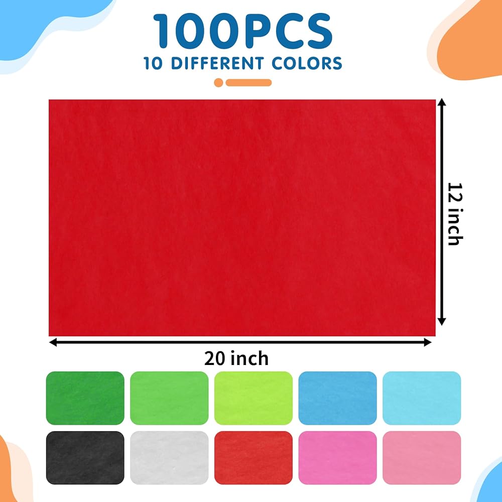 عبوة قيمة للغاية - 100 قطعة من المناديل الورقية بألوان متنوعة (10 ألوان مختلفة، 10 قطع من المناديل الورقية بلون واحد، كل منها حوالي 20 × 12 بوصة/50 سم × 30 سم)، مما يجعل هديتك أكثر روعة وإبهارًا.