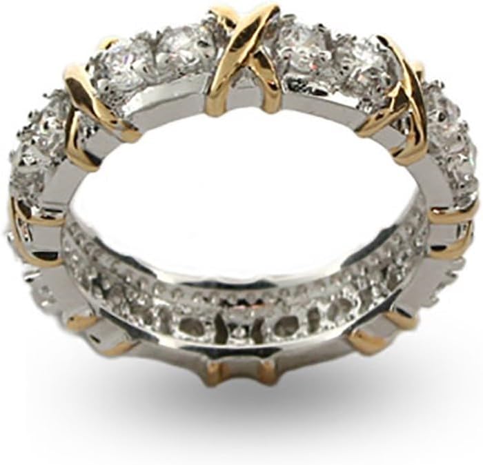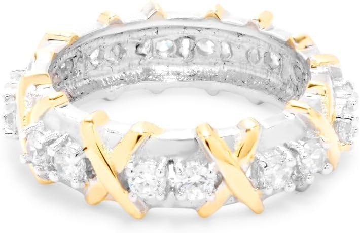 This Designer Style 16 Stone Two Tone X Cubic Zirconia Ring is a beautiful delight from any angle. A double pattern of sparkling round, white cubic zirconia stones is followed by gold alternating X symbols around the entire setting. The pattern on this two-tone CZ eternity ring gives an otherwise simple style a unique and surprising look that will be the envy of your friends. The glittering faux diamonds measure 5 millimeters wide for a total of .48 carats of pure beauty that sparkles in the sun. The result is a comfortable, lightweight sterling silver cubic zirconia eternity ring with a show-stopping finish that wow your friends and family with its creative design and impressive attractiveness. Available in sizes for women 5-9 this enchanting ring is only 4.6 grams in weight and will sit comfortably when placed on her finger throughout the day. A delightful gift for any occasion to give to a special loved one like your wife, mother, daughter or a special friend. It would make a terrific birthday gift for your daughter. A romantic anniversary gift for a husband to give his wife. Your mother would love this on Mother�s Day. Let Grandma know how wonderful she is when gifting this to her at your next visit. This gorgeous Designer Style 16 Stone Two Tone X Cubic Zirconia Ring ships with a beautiful black velvet pouch and gift box to complete the moment of showing how much you care.