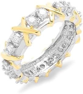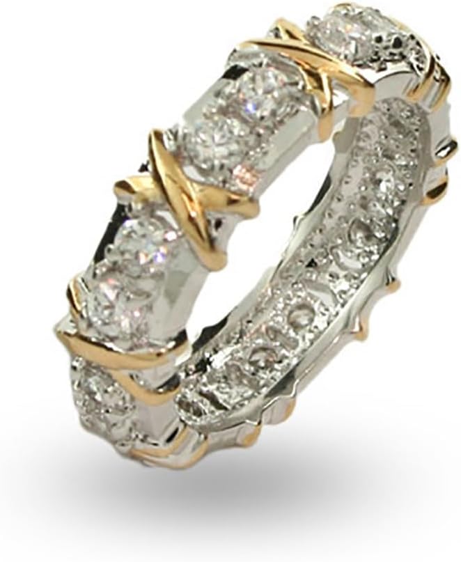 Crafted Size & Material: 0.48 carat round brilliant cut white cubic zirconia stones, 16 stones; 5mm sterling silver band with gold tones; 4.6 grams total weight; eternity band; lightweight, casual and formal fashion style. Can be used as a wedding ring, promise ring, commitment ring. Available in ring sizes 5 to 9.