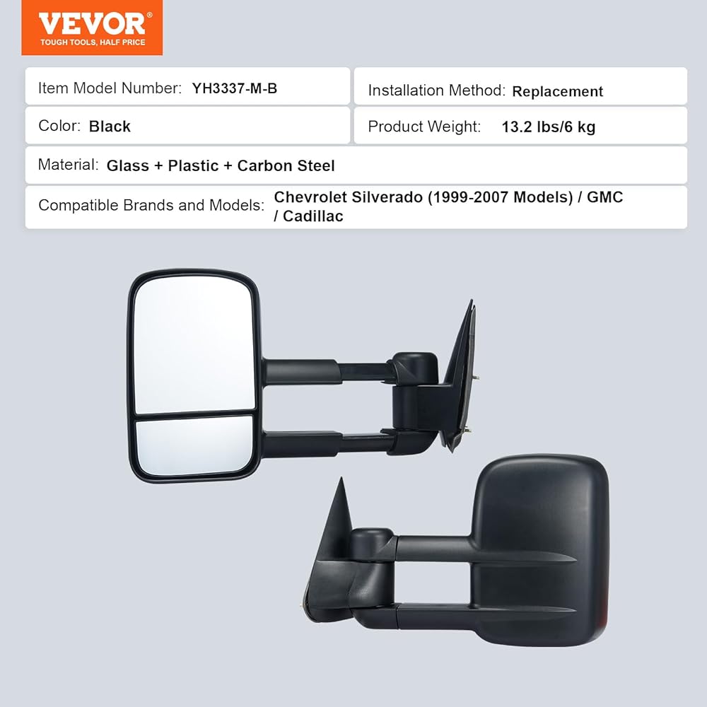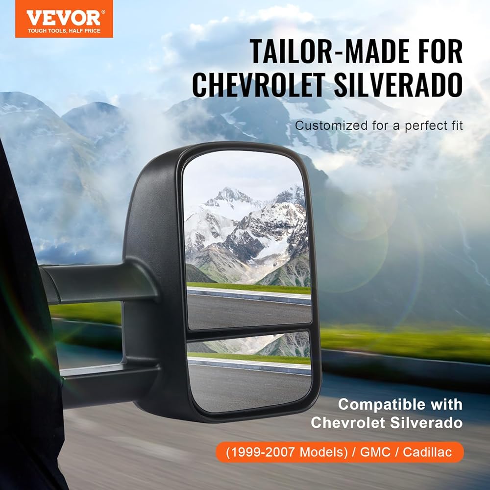 VEVOR Towing Mirrors, Left & Right Pair Set for Chevrolet Silverado (1999-2007)/GMC/Cadillac, Tow Mirror with Plane & Convex Glass, Manual Controlling Telescoping Folding, Four-Way Adjustable, Black