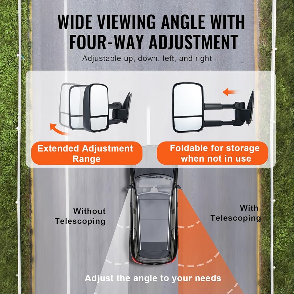 Four-Way Adjustment: With advanced multidimensional adjustment, you can tweak the tow mirrors to just the right angle for your driving style. Whether it's vertical or horizontal adjustment, precise control is achievable. No more blind spots ruining your day – get ready for a safer, smoother ride.