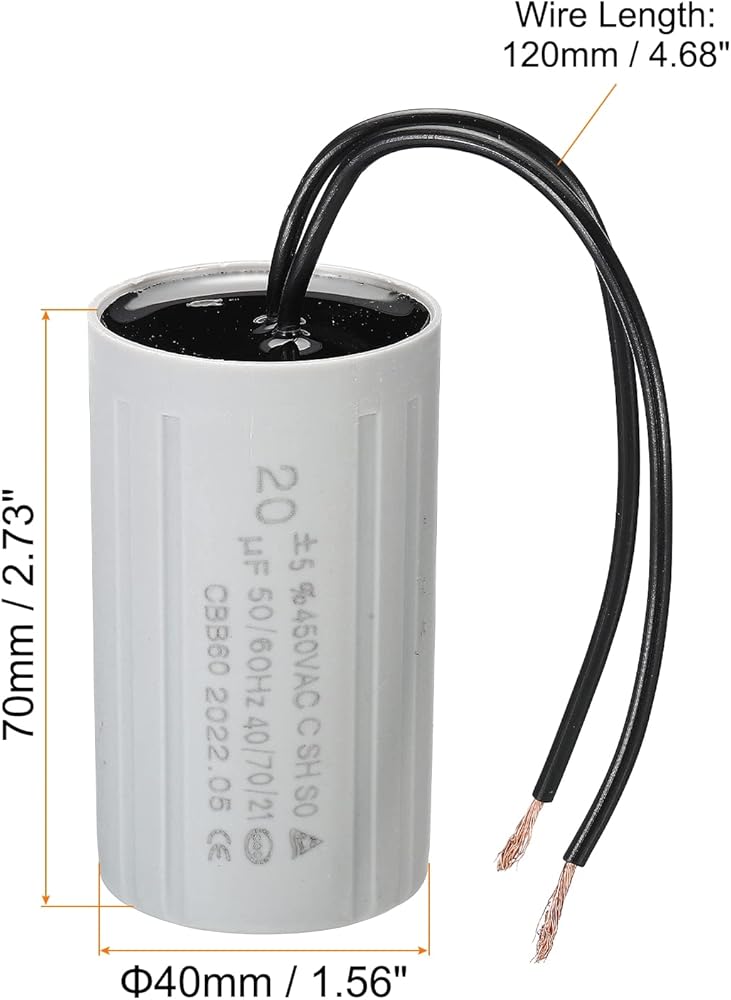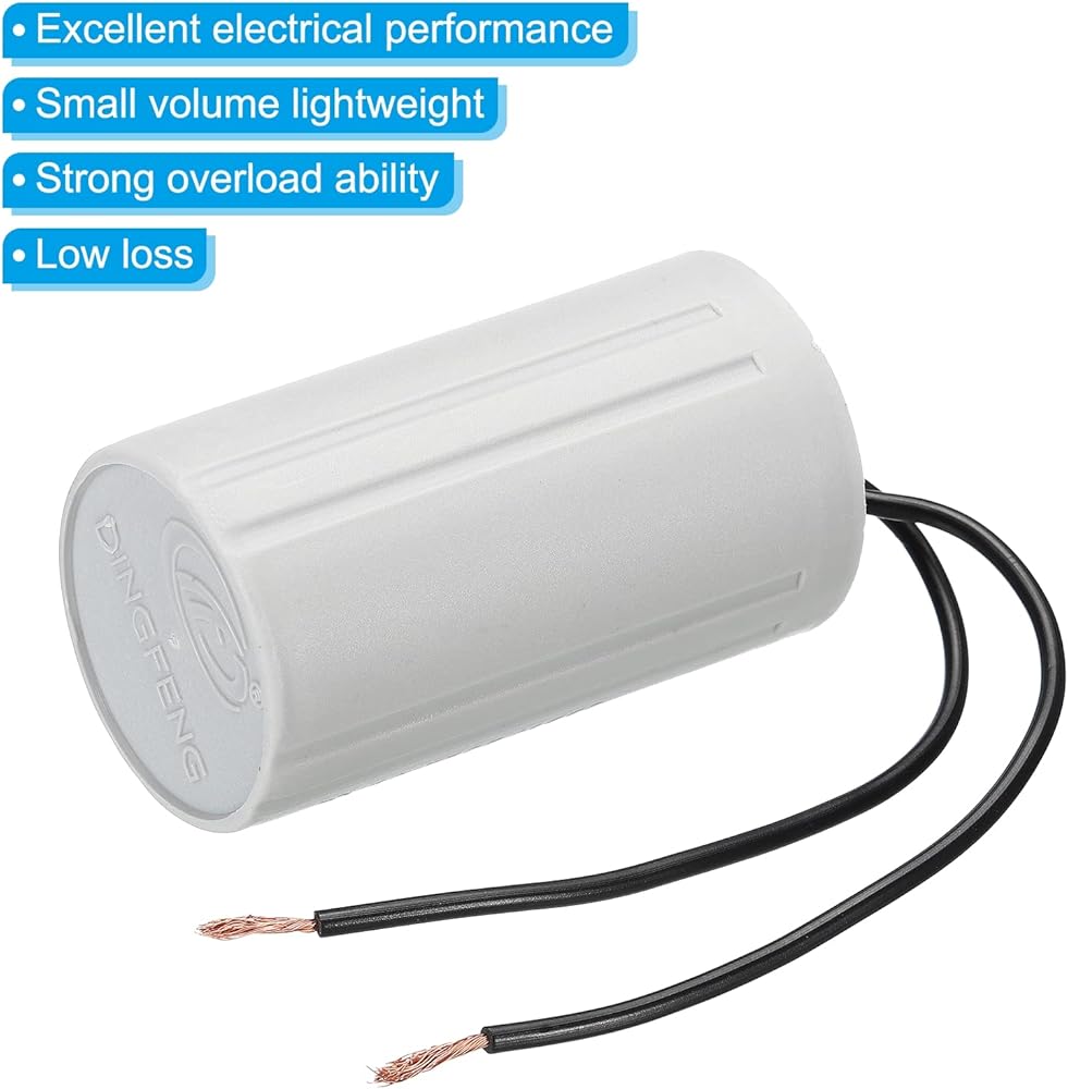 Specification: Model: CBB60; Material: Polypropylene Film Plastic Shell; Lead End: 2 Wires; Tolerance: ±5%; Rated Capacity: 30uF; Climatic Category: 40/70/21; Body Size: 70x42mm/3.63x1.64inch (L*D); Shell Color: Grey; Wire Length: 120mm/4.68inch; Pack of 2Pcs Run Capacitor