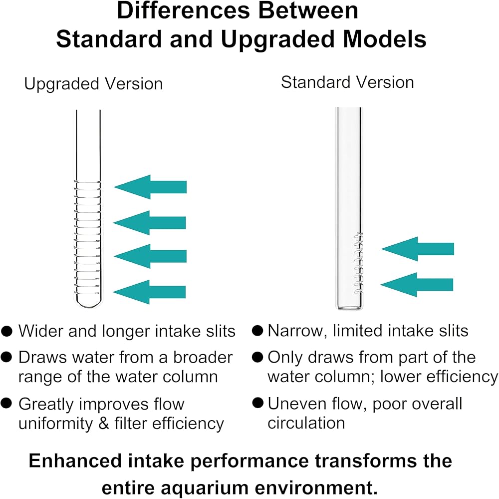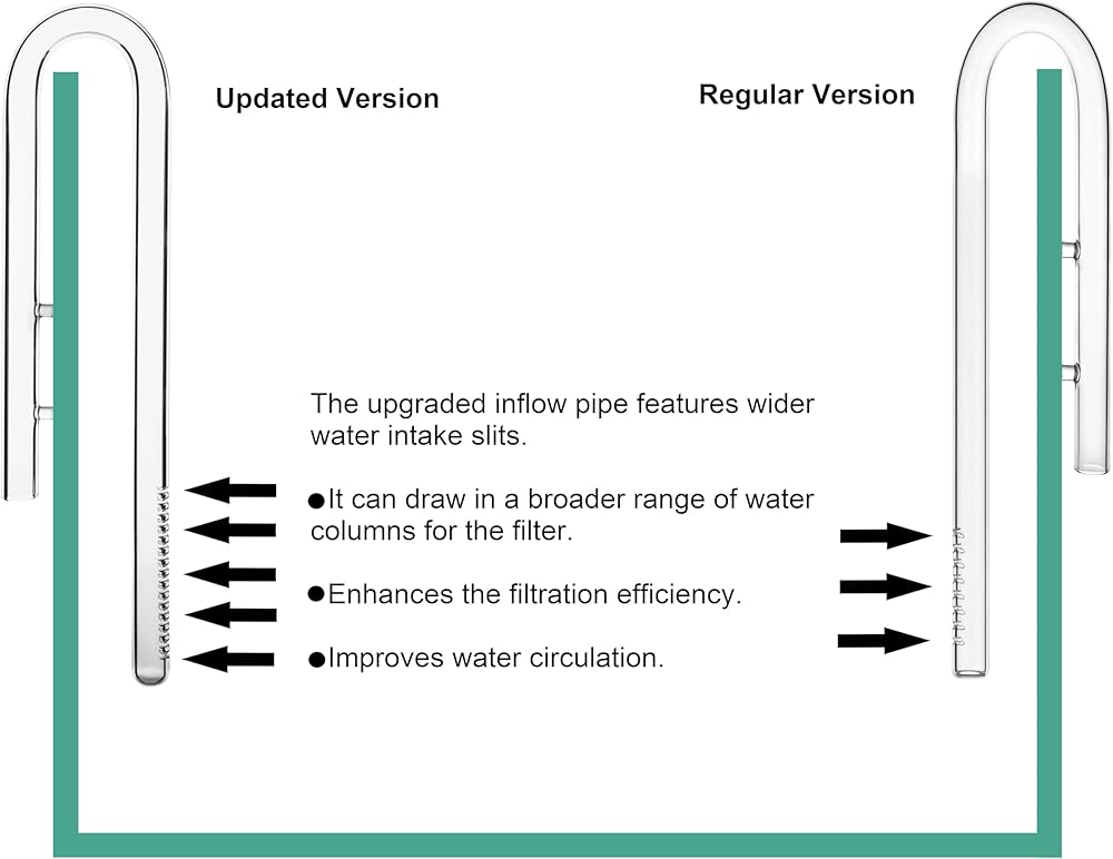 Version Upgraded: The upgraded inflow pipe features wider water intake slits. It can draw in a broader range of water columns for the filter. This enhances the filtration efficiency. It also improves water circulation
