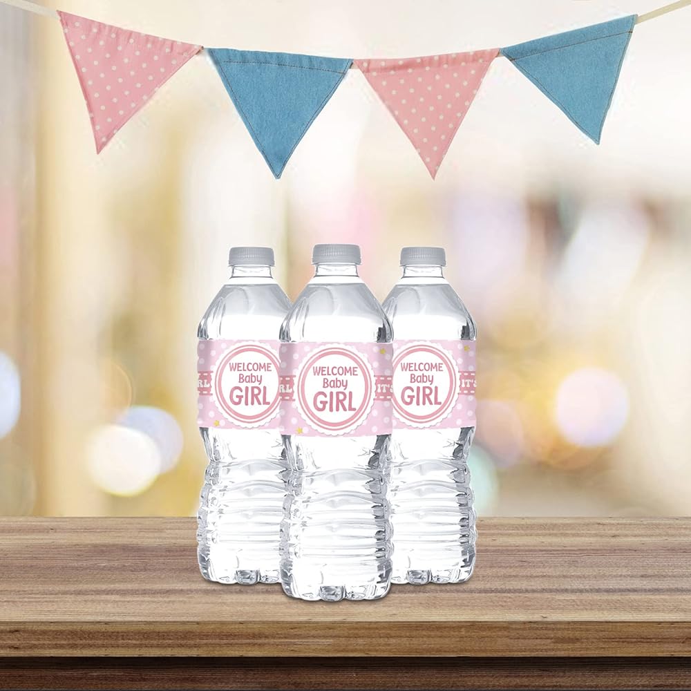 MonMon & Craft Welcome Baby Girl Water Bottle Stickers/Gender Reveal Bottle Wrappers/It's a Girl Water Labels Supplies/Baby Shower Decorations Pink (Set of 32)