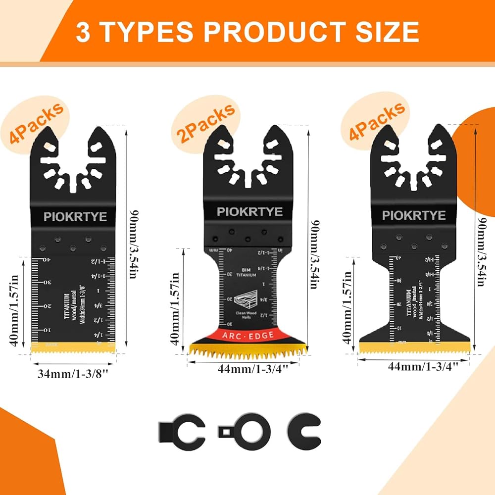 【3 Types 10Pcs Titanium Oscillating Tool Blades】This multi-tool blade kit has 13 parts, including 3 different shapes of titanium plated saw blades and 3 clip adapters.