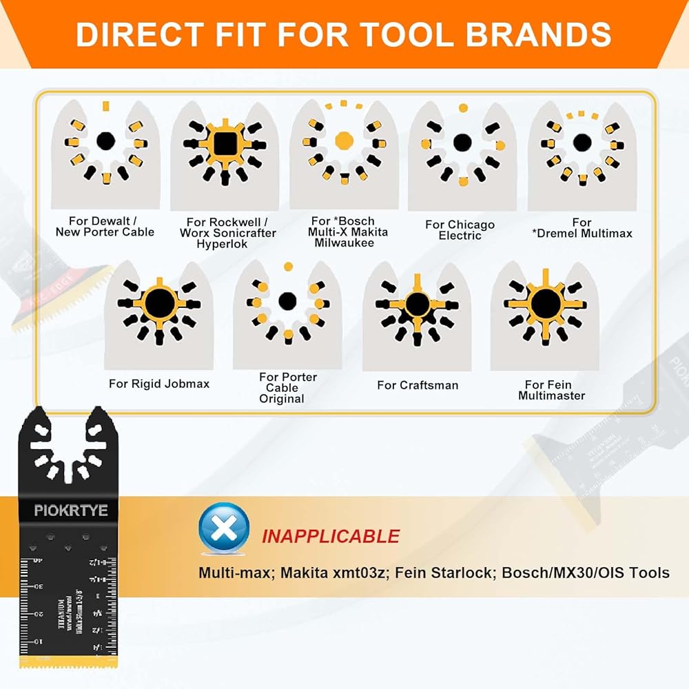 【Universal Compatibility】With the universal interface system, Our quick-release saw blades are compatible with most brands of oscillating tools on the market. Such as Milwaukee, Makita, and Dewalt. ▲NOTE: it's not recommended to use this set for the tools of the starlock and starlock plus interface system, and MM30, MM40, and MM50.