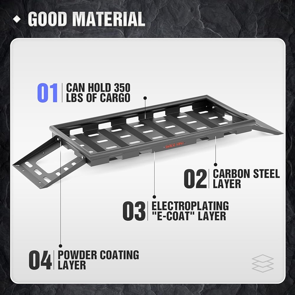【Sturdy and Durable】: Constructed with high-strength steel, precision laser-measured and cut to ensure a proper fit. The cargo rack is made with corrosion-resistant coating and high-quality electronic coating for enhanced rust protection. With a corrosion-resistant process lasting up to 8 years under normal usage, it exhibits exceptional durability and longevity.