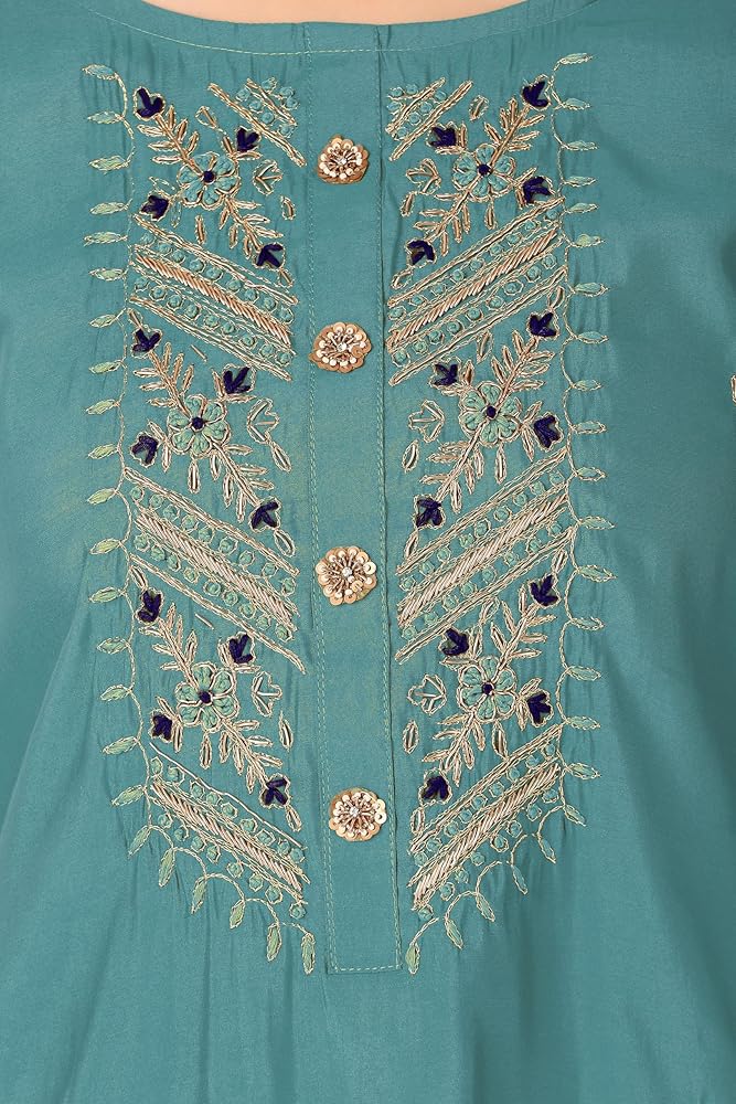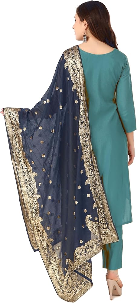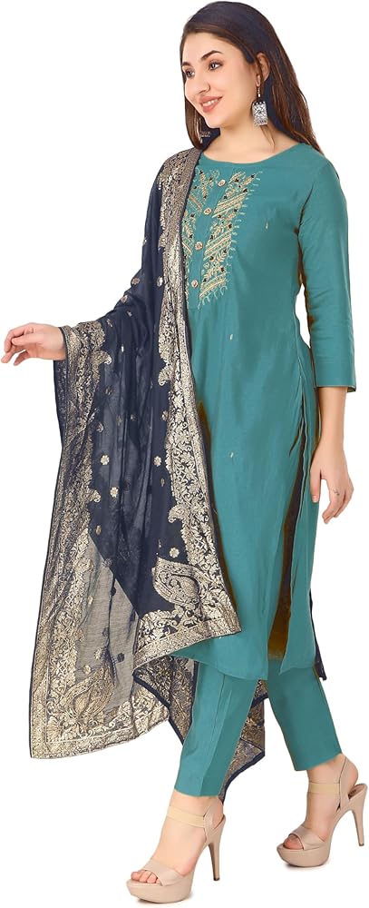 3-Piece Set: This set includes a Kameez, Bottom, and Dupatta, offering a complete ensemble...KAMEEZ: Made from Plain Silk material with heavy gold zari embroidery and zardosi handwork along with french knots at the neckline. | LENGTH: 45 inches | Sleeves: 3/4 Length. | This kameez comes with lining attached...BOTTOM: Made from silk material in straight pants style..| BOTTOM LENGTH: 38 inches with a leg opening of 14 inches | Elastic Closure ..DUPATTA: Crafted from Banarasi silk gold jamewaram gold weaving fabric in elegant designs...Find the perfect fit with our size options, based on the ready garment measurements of the chest. For more sizing details, please refer to the last product image featuring the Size Chart...