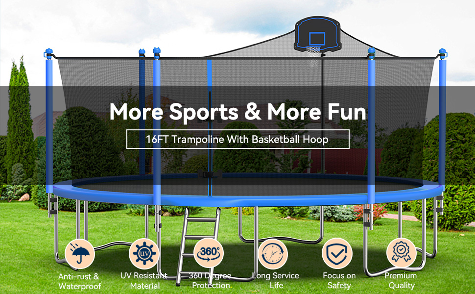 【Big Trampoline for Kids and Adults】 Tatub 16ft trampoline with basketball hoop, which is an excellent choice in your backyard. Safe jumping exercise can improve you and kids' coordination, balance, and cardiovascular health